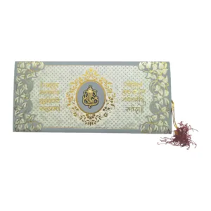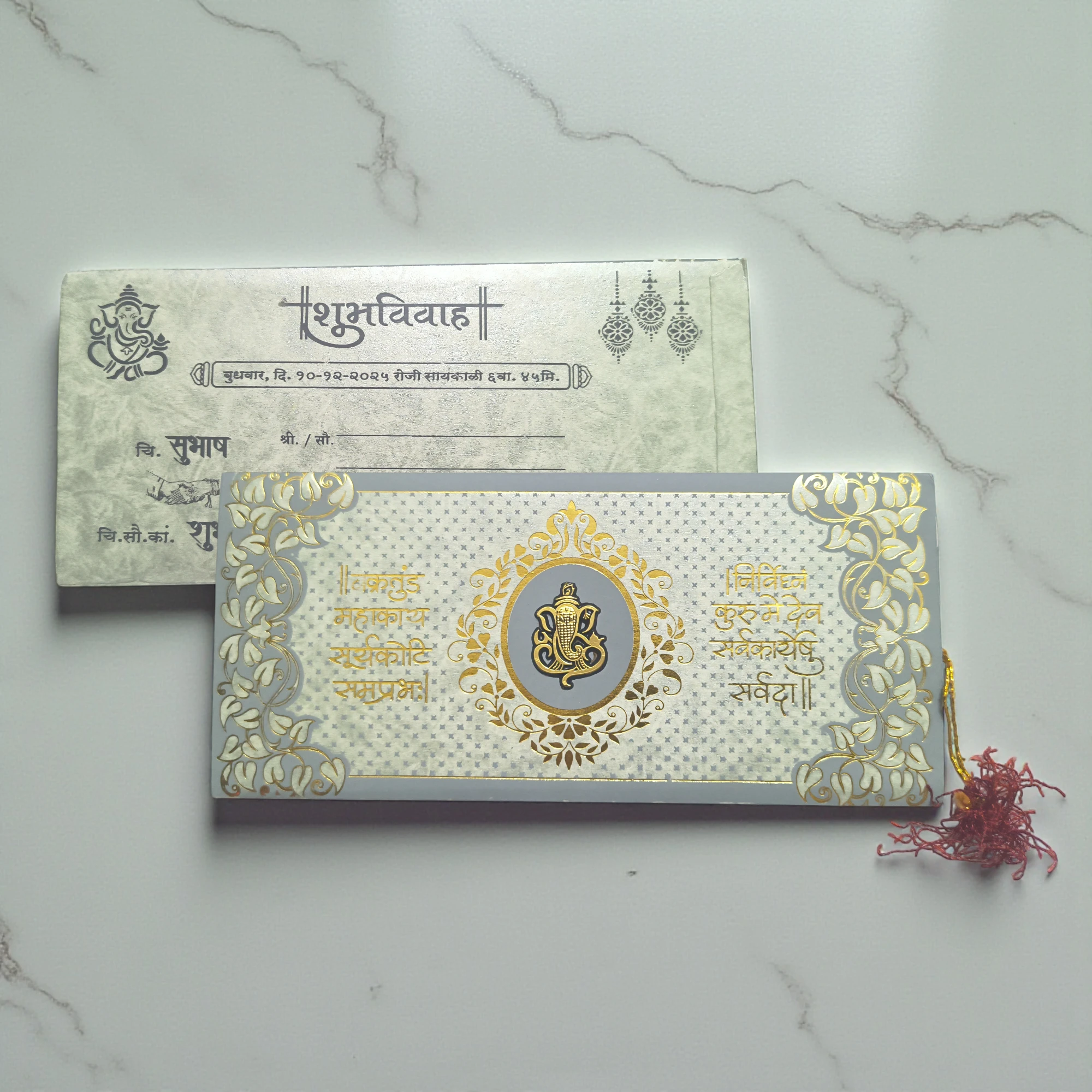 • Sacred Golden Thread with Red Gonda: A holy golden thread tied with a red gonda enhances the spiritual significance of the card, making it ideal for Maharashtrian wedding invitation cards with traditional elements.