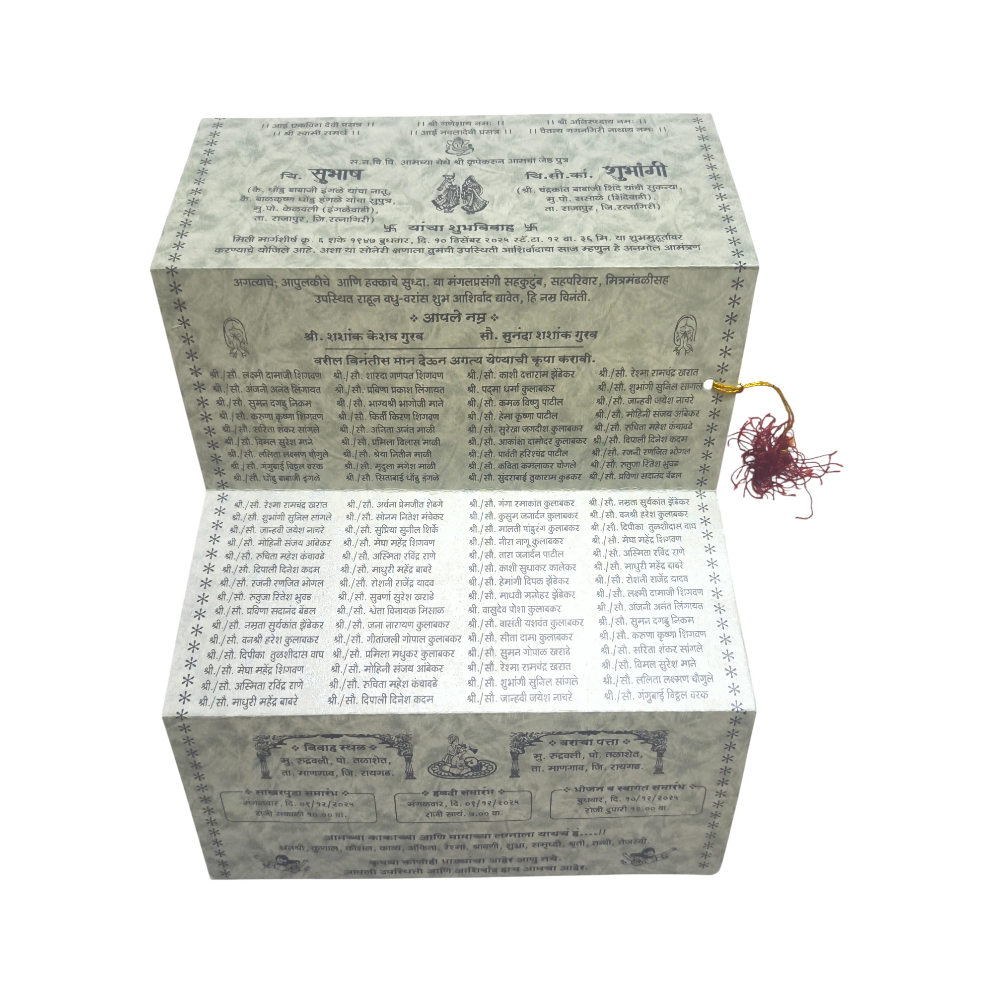 Open the card to reveal a premium 3-fold Lagna Patrika in Marathi, made from high-quality grey paper that strikes the perfect balance between elegance and durability. The inner folds offer generous space for printing all your wedding details—rituals, timings, and heartfelt messages—making it ideal for both traditional and modern ceremonies. A sacred golden thread with a red gonda is delicately tied inside, adding a spiritual touch that resonates with Marathi customs and rituals.