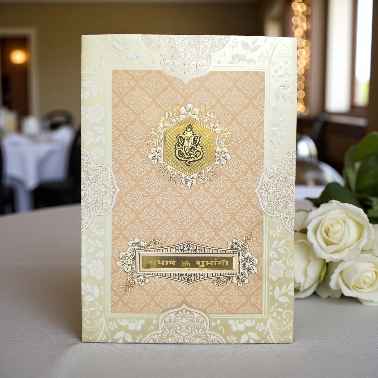 Introducing the Aarambh Floral Laser Cut Single Fold Marathi Lagna Patrika With Acrylic Lord Ganesha White—a masterpiece that beautifully captures the essence of Maharashtrian wedding traditions while embracing modern sophistication. This Marathi Lagna Patrika is not just an invitation; it’s a soulful expression of your sacred union.
