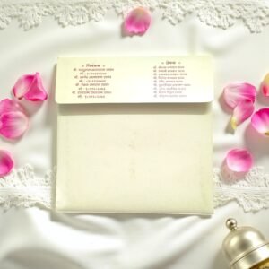 – Envelope: Cream-toned front with vibrant multicolour floral motifs, featuring a circular laser cut centerpiece that offers a peek into the divine.