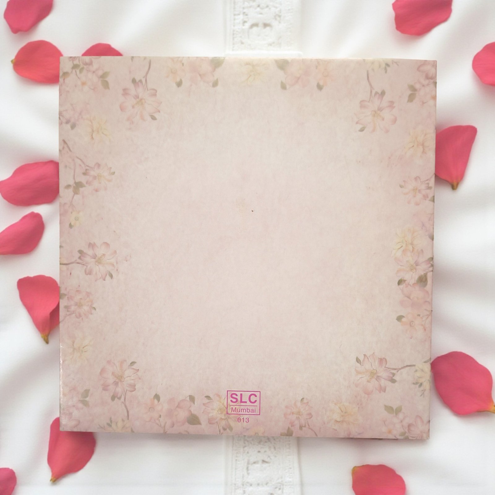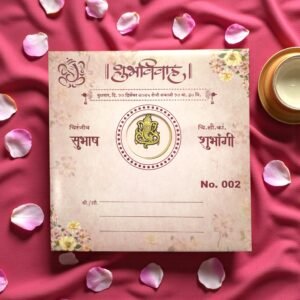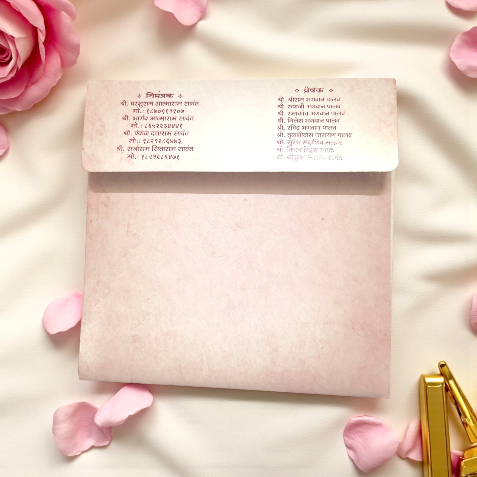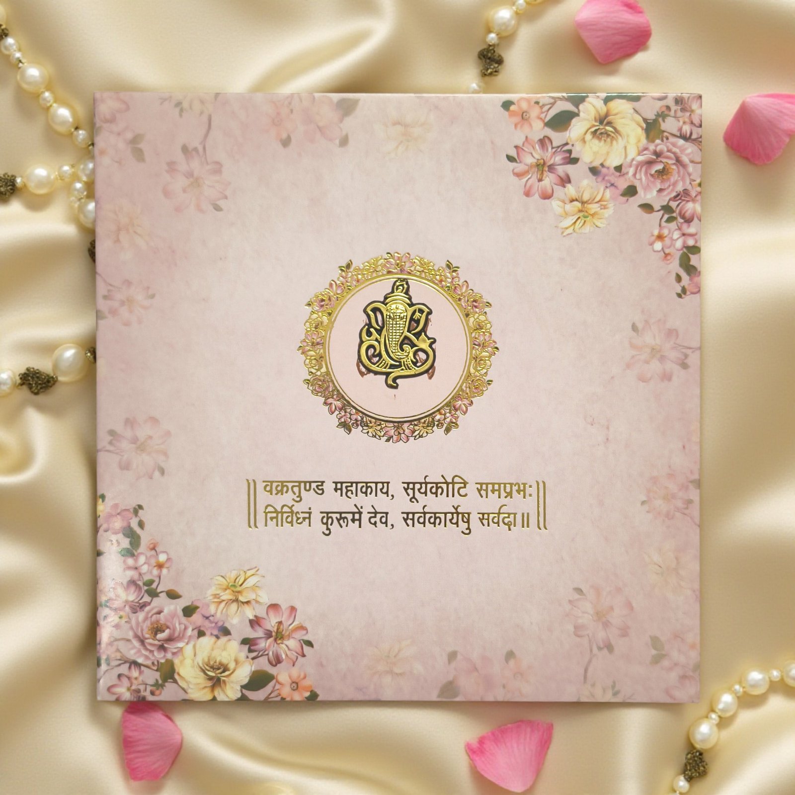 The main card, crafted from premium single-fold paper, mirrors the envelope’s floral beauty and pink palette. At its heart sits a stunning acrylic Lord Ganesha, symbolizing auspicious beginnings. The revered Vakratunda Mahakaya Shloka adds spiritual depth, making this more than just an invitation—it’s a blessing.