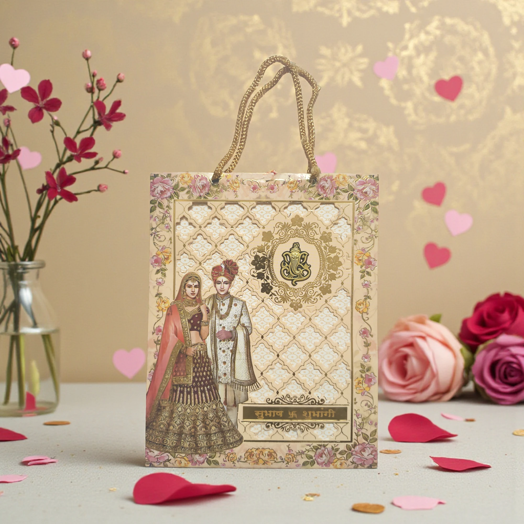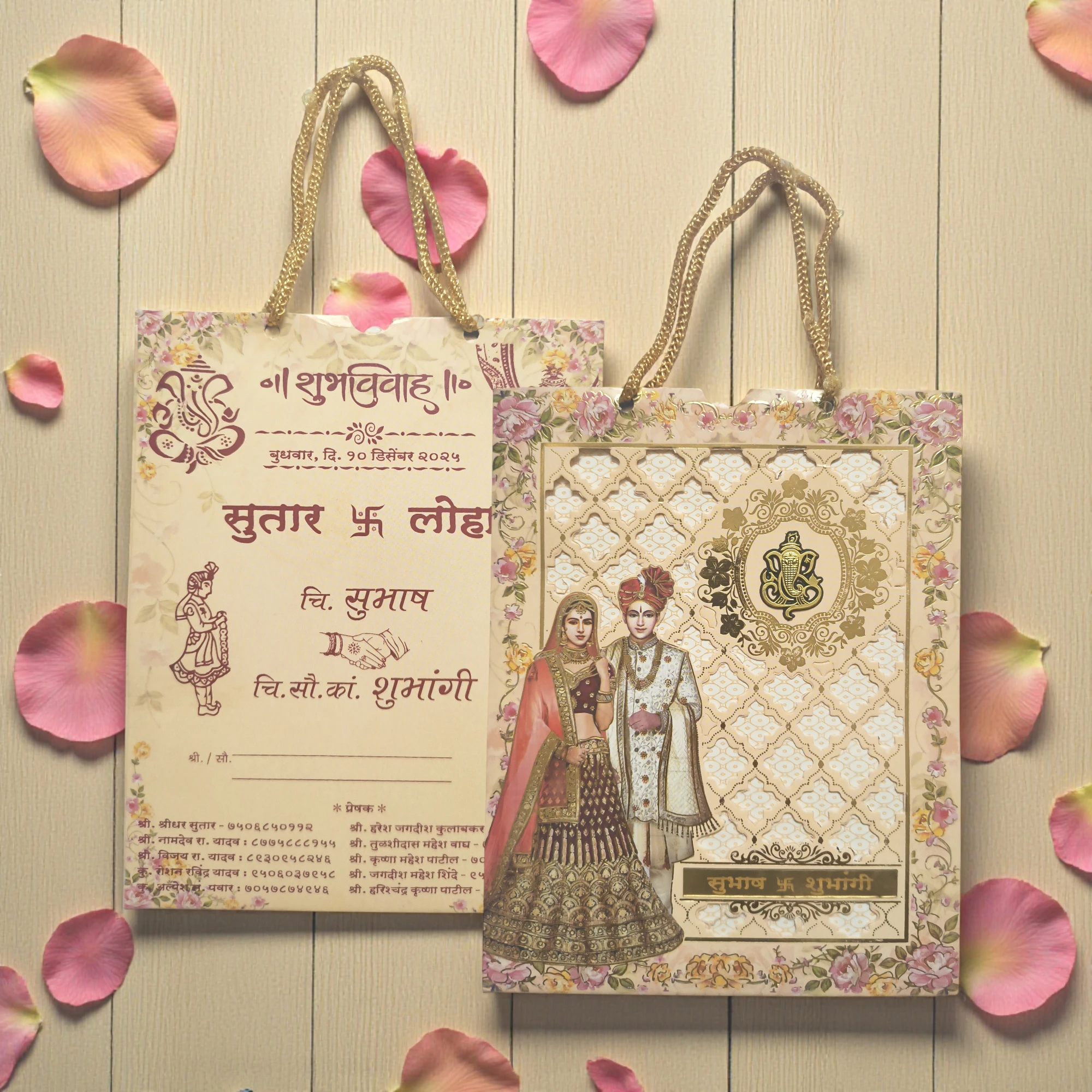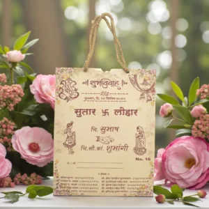 Adding to its charm, the jacket features a divine acrylic Lord Ganesha emblem at the top, invoking blessings for a blissful beginning. At the bottom, a custom acrylic nameplate elegantly displays the couple’s names, offering a personalized touch that transforms the card into a cherished keepsake. A delicate lace handle tied at the top not only enhances its aesthetic appeal but also makes it easy to carry—perfect for hand-delivered invitations.